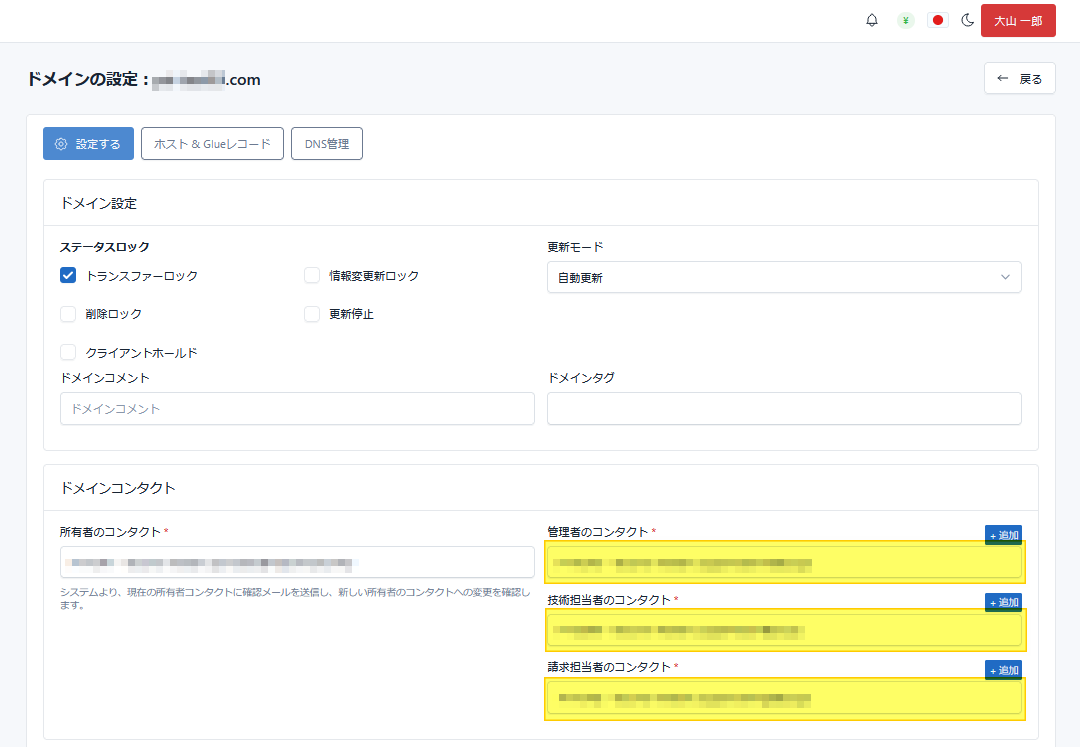- 登録者(Registrant)情報の変更を行う場合は、こちらをご覧ください。