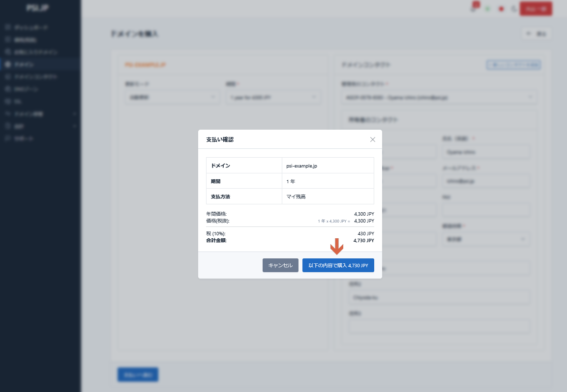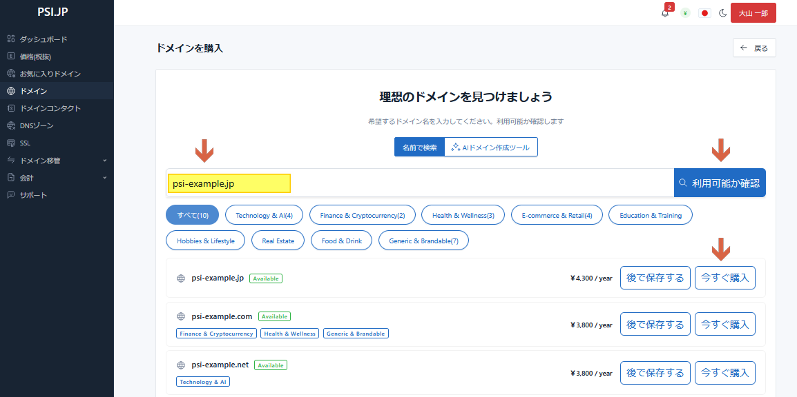- 検索結果に表示されたドメインの中から、取得するドメイン名の[今すぐ購入]をクリックする。