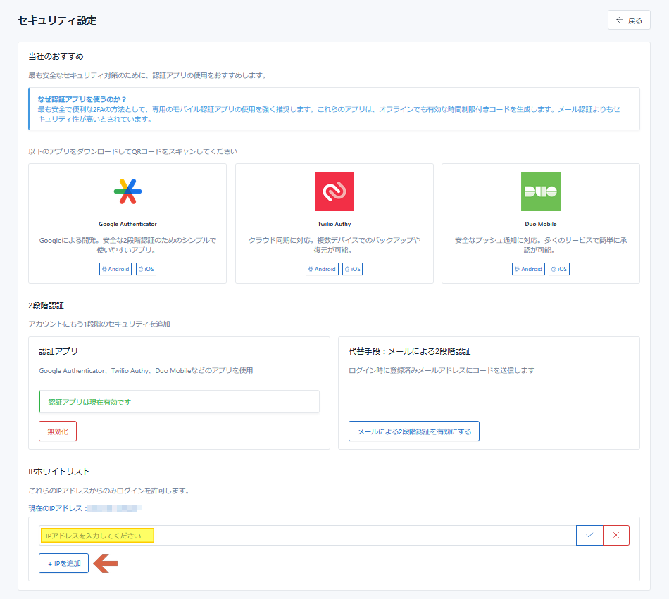 ◆ 「プロフィール」→[セキュリティ設定]→IPアドレスを入力→[+ IPを追加]