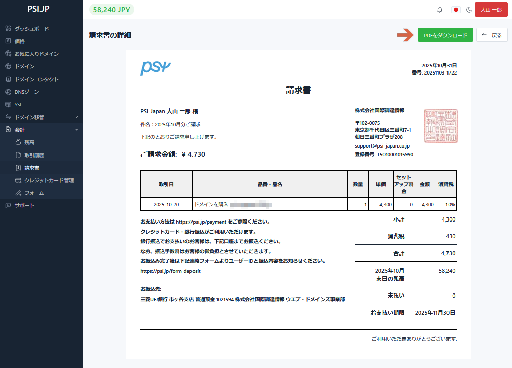 毎月の請求書PDFを、管理画面の請求書メニューよりダウンロードできます。