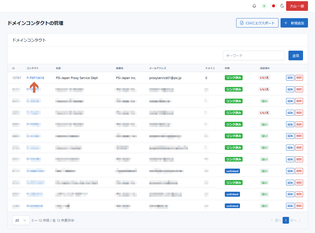 ◆左メニュー「ドメインコンタクト」→ドメインコンタクトの管理→コンタクト→コンタクトの詳細