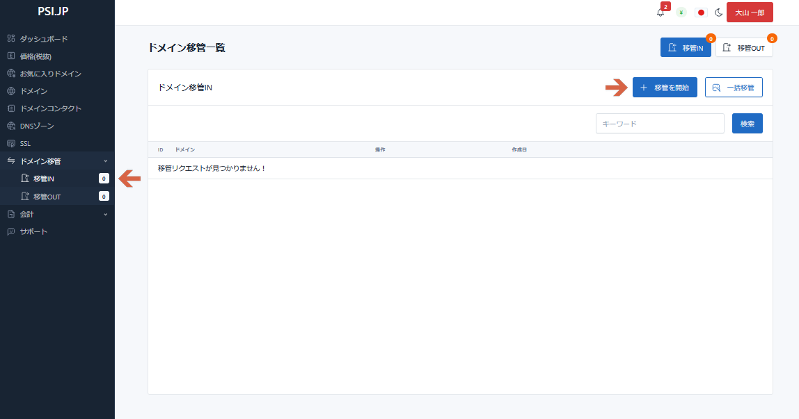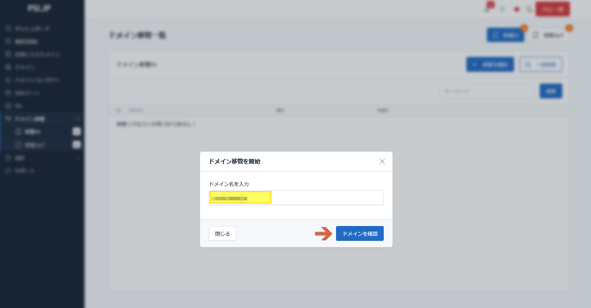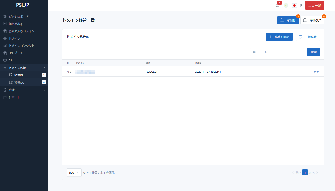 ◆ドメイン移管一覧にドメイン名が表示されます。