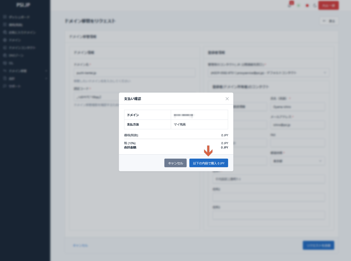 ◆[以下の内容で購入 0 JPY] をクリックする。