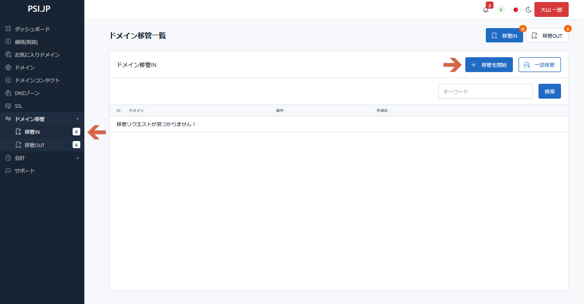 ◆左メニュー>ドメイン移管>移管IN [+移管を開始]をクリックする。