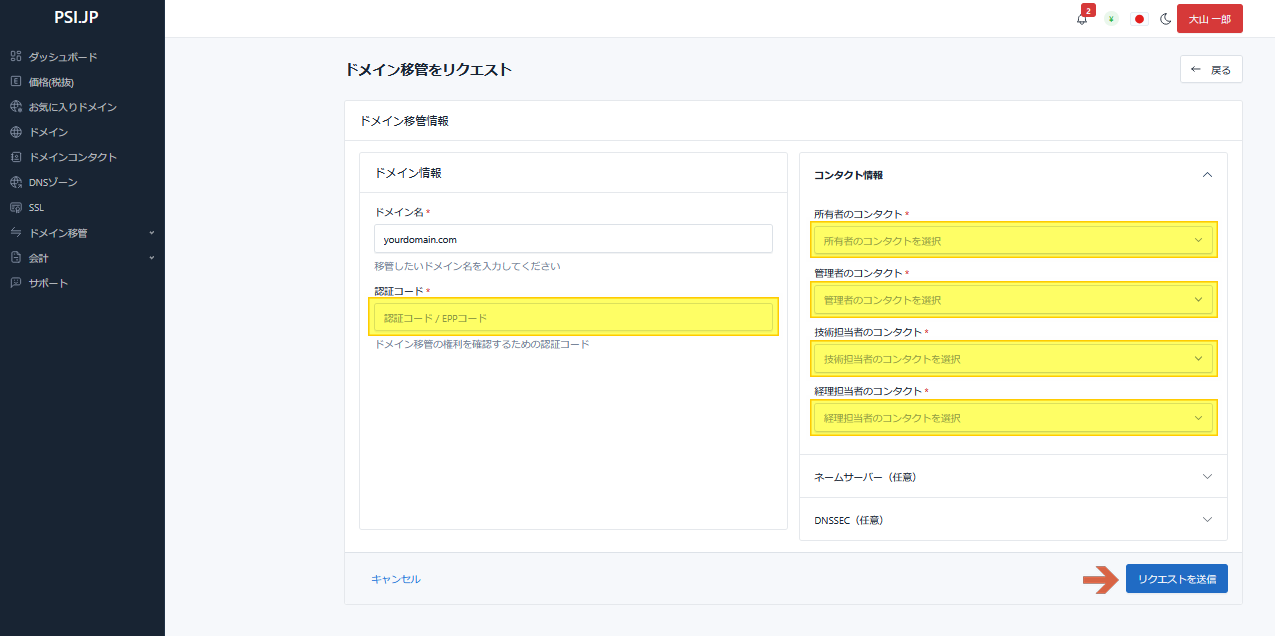 ◆認証コード・コンタクト(所有者・管理者・技術担当者・経理担当者)を入力、 [リクエストを送信]をクリックする。